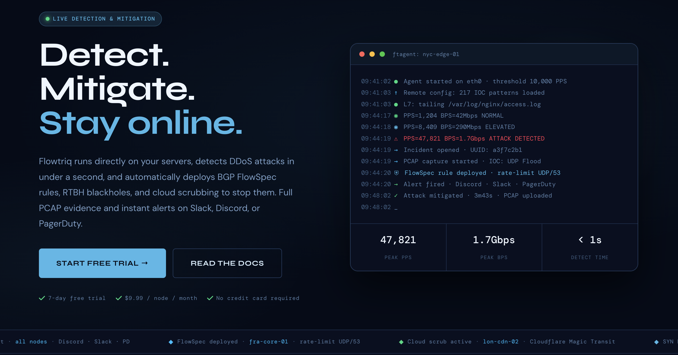 Flowtriq instantly detects DDoS attacks and auto-mitigates within seconds, ensuring server uptime for just $9.99/node/month.